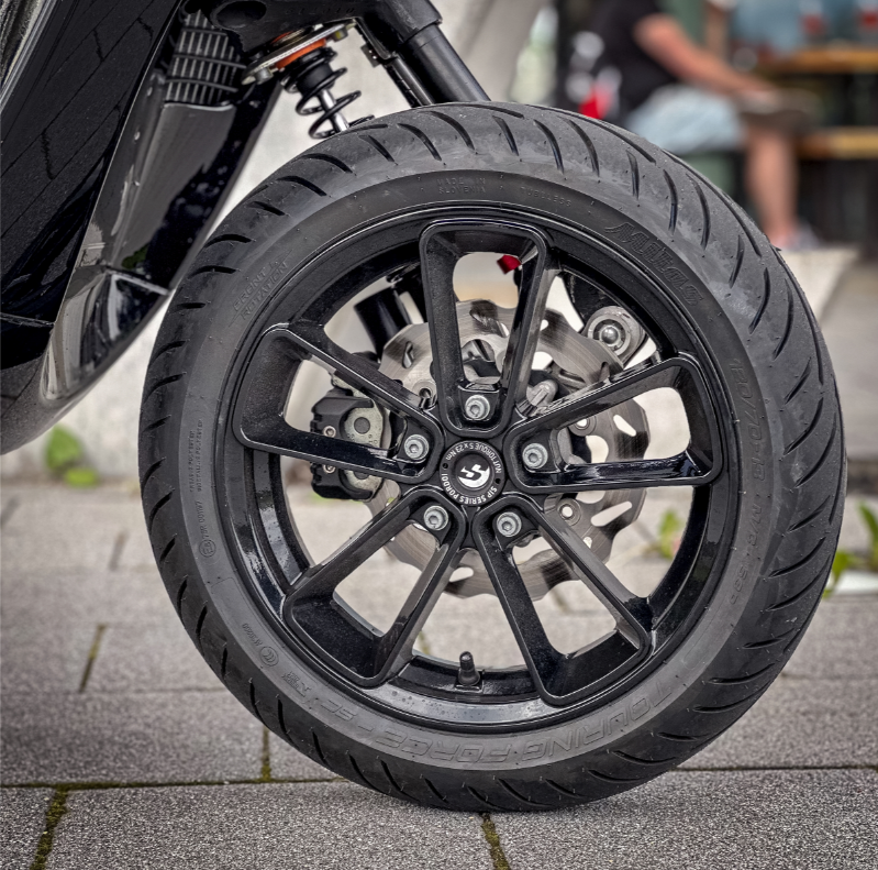 Erste existierende 13“ Felge welche mit der ABE problemlos an der GTS gefahren werden darf. Keine rechtlichen Grauzonen mehr, keine Streitereien mit den TÜV-Prüfern – Felgen einbauen und fertig ist die legale Umrüstung auf 13“. Auch mit einem 140er Breitreifen am Hinterrad homologiert - statt dem serienmäßigen 130er Reifen kann hinten nun auch ein Reifen der Größe 140/60-13“ ganz legal gefahren werden. Die Felgen selbst werden unter Berücksichtigung der ETRTO (European Tyre and Rim Technical Organisation) Richtlinien, der Industrievorgabe für Felgen- und Reifenproduktionen, gefertigt.